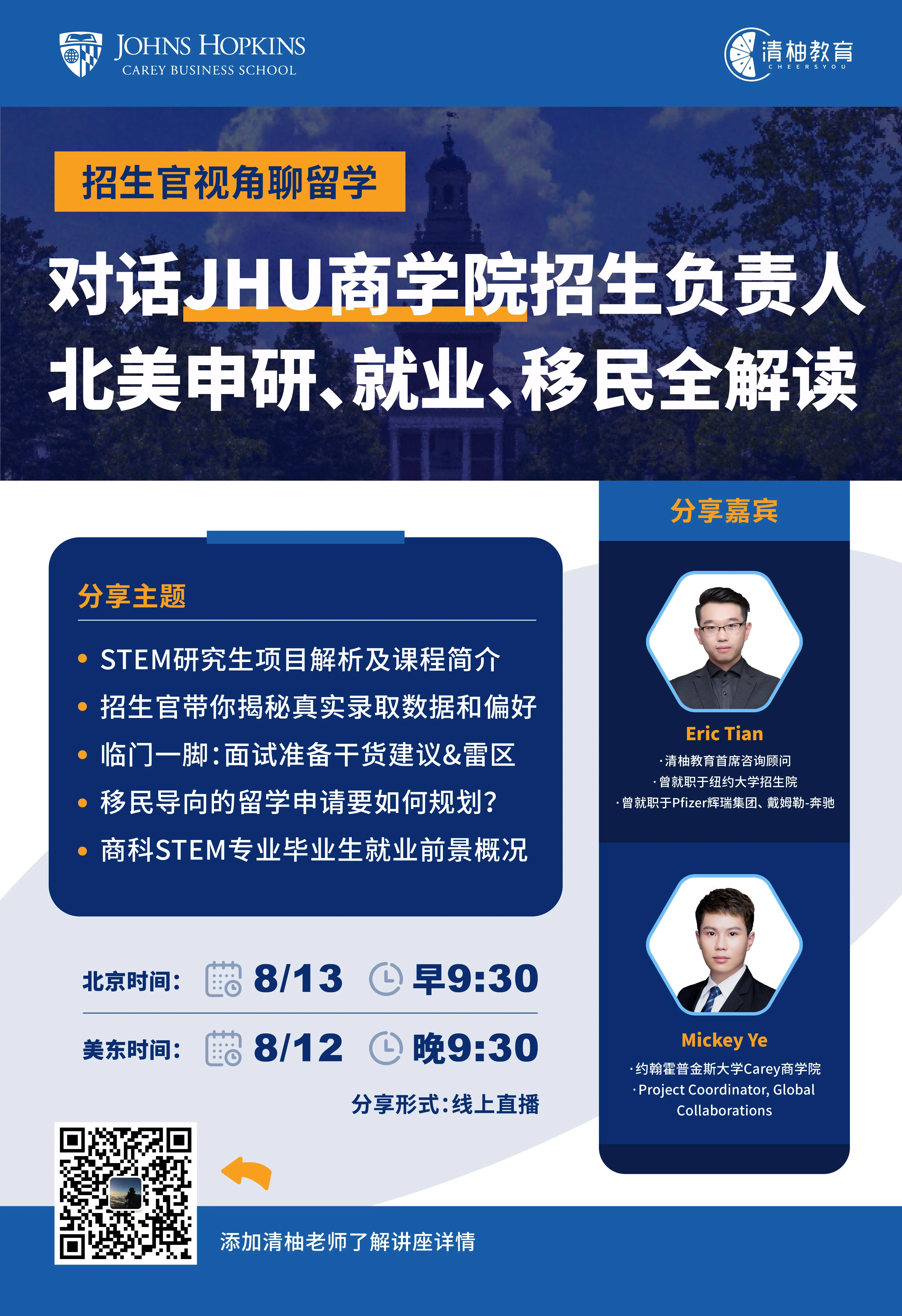 清柚特邀【JHU Carey现任招生官】 ,北美申研/就业/移民全面解读