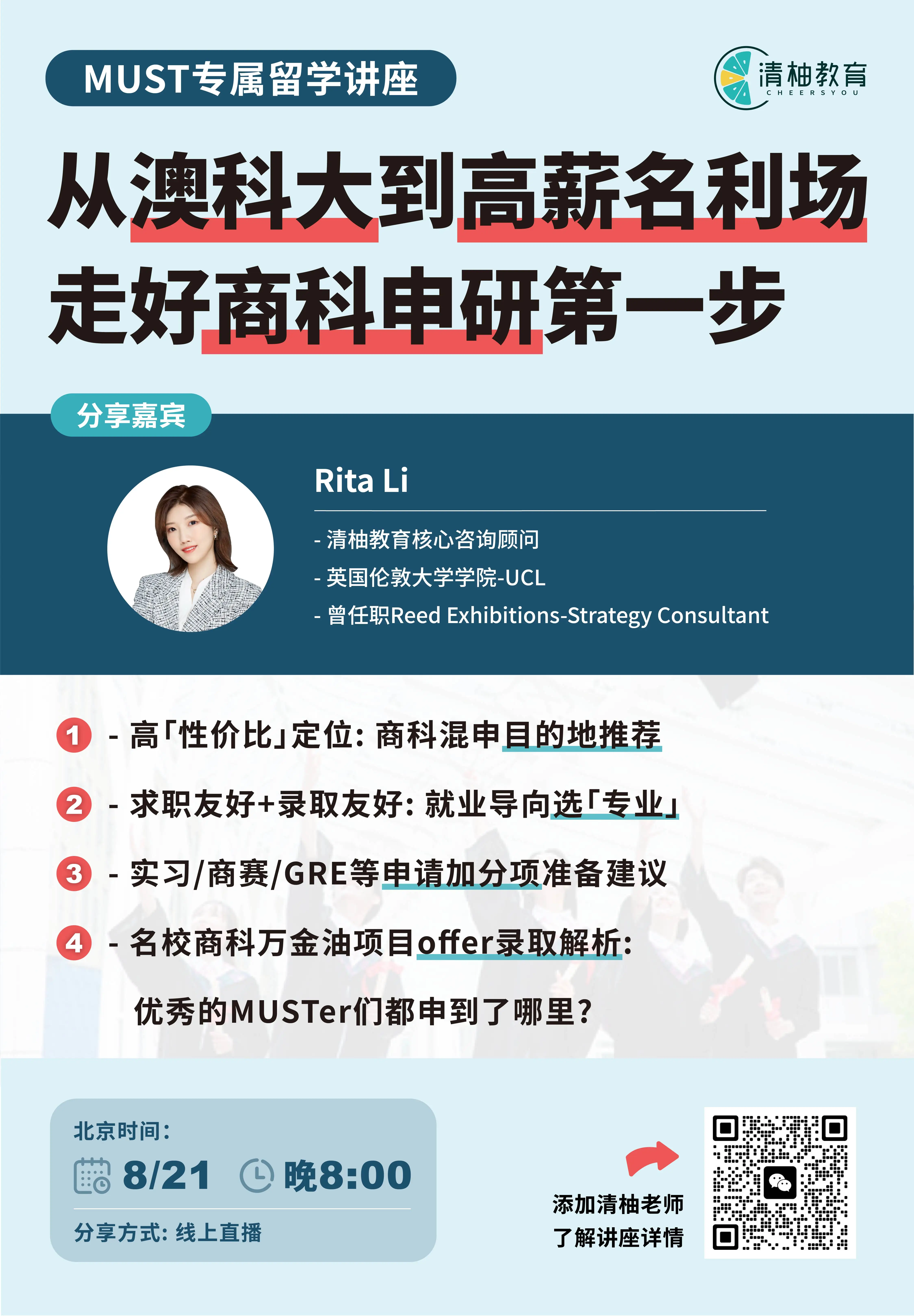 【澳科大-商科专场】从就业倒推留学目的地&专业!从真实申请案例中发现背提加分小技巧!8/21号晚8点,MUSTer必看!