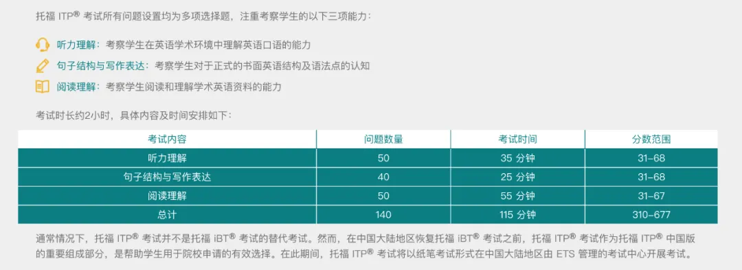 与大家所熟知的托福iBT考试一样,ITP考试其实也是ETS旗下的主要产品之一。它是用来考察学生在听力理解、阅读理解和句子结构与写作表达三大方面的综合语言分析能力。