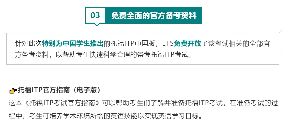 深知这一点的ETS大方地给出了免费官方复习资料,包括ITP官方指南电子版和练习题,着急出分的同学们快去ETS官方网上阵地领取吧!