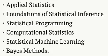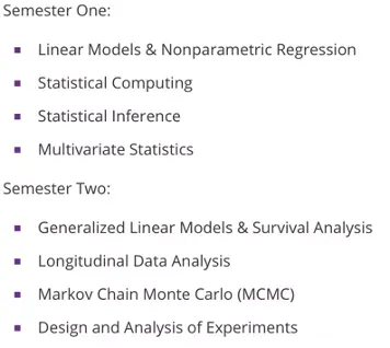 学生需要完成应用统计、计算统计、统计推断基础、统计概率、统计研究项目等五个核心模块和一些专业相关选修课的学习。在学年的5月到九月期间,学生不再需要上课,而是和导师一起完成科研项目。