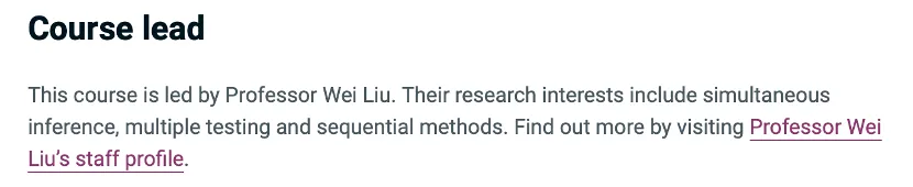 和曼大一样,南安普顿大学的统计学专业也是由一位华人教授Wei Liu领衔。Wei Liu教授在统计学方面有着资深的教学经验,1990年获得统计学博士学位后就被南安普顿大学聘为终身讲师。