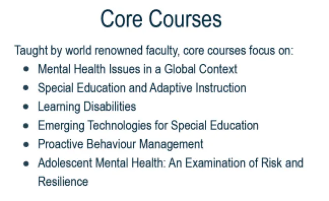 该项目主修10门课程(其中8门需在OISE完成,其余2门可远程)。核心课程包括:全球背景下的心理发展和教育问题、特殊教育与融合教育、学习障碍、教育和特殊教育之新兴技术、主动行为管理、青少年心理健康。
