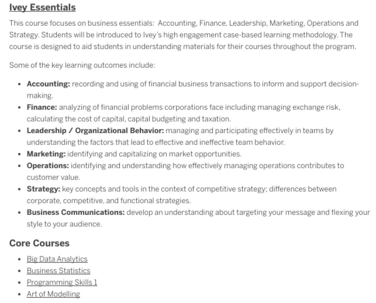 Ivey的管理学硕士Master of Science in Management(MSc)项目为期16个月,注重实际案例教学,培养学生的领导力和职业技能。该项目下有4个方向可供选择,包括商业分析(Business Analytics)、国际贸易(International Business)、数字管理 (Digital Management)和国际管理 (International Business+CEMS-MIM)。