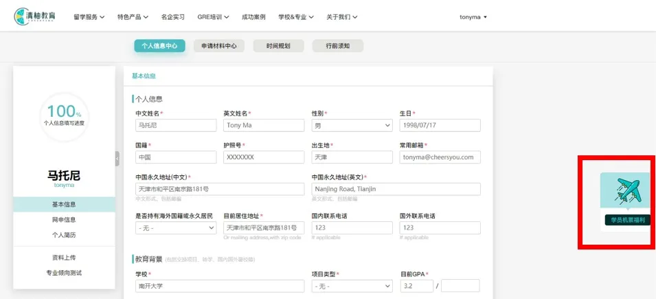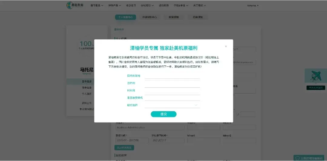 清柚签约学员们只需要登录个人申请后台,点击画面右侧的【学员机票福利】,填写相关信息,即会有专人与你取得联系,负责购票事宜。