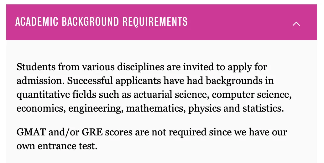 例如,滑铁卢大学的Quantitative Finance硕士虽然不要求提交GRE成绩,但是有自己的入学考试,对申请者进行概统背景的考核。这种考试一般比GRE考试还要更难。