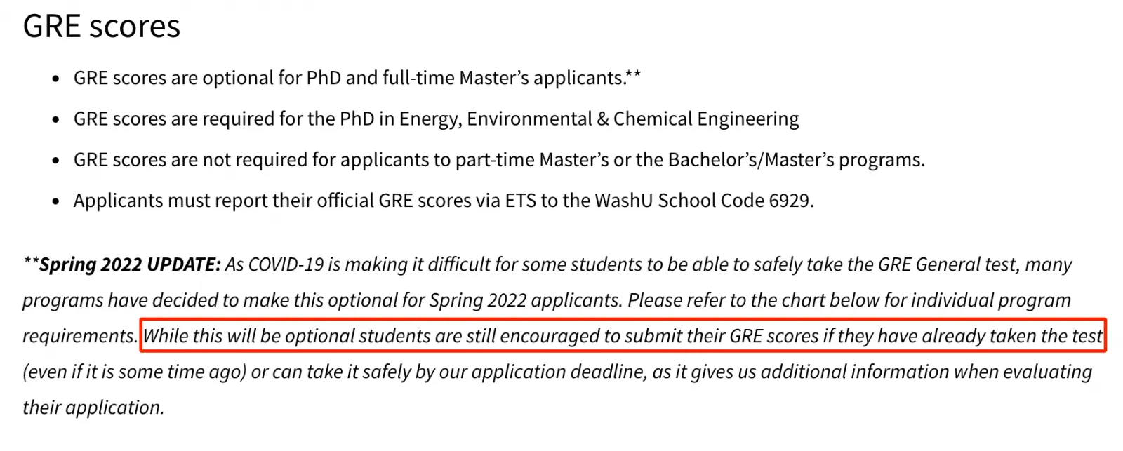 华大圣路易斯的工程学院,2022春季申请对GRE采取可选择性提交的政策,但是官网也明确鼓励学生如果有GRE成绩可以提交,帮助招生办评估学生能力。