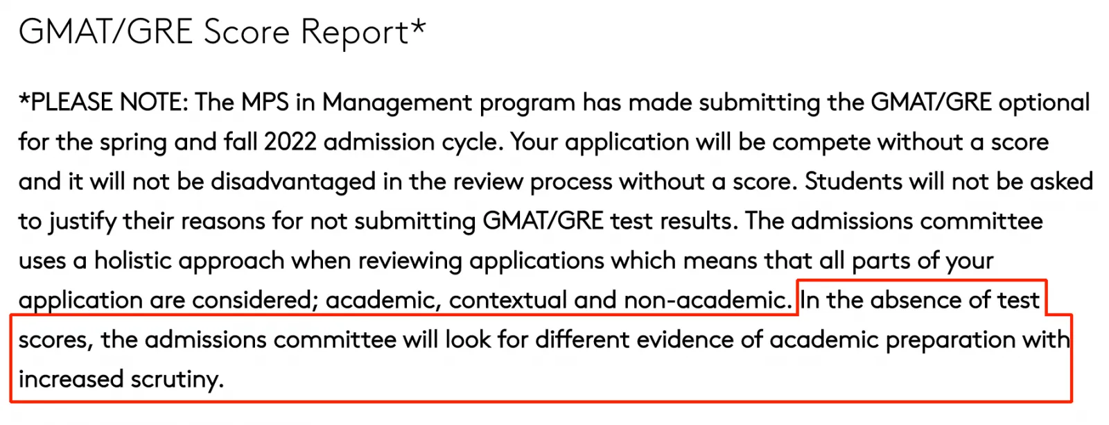 康奈尔商学院下的管理学硕士,虽然2022申请季同样不要求GRE/GMAT成绩,但是项目也明确提出,缺少标化成绩,招生办会通过其他申请材料来评估你的学术能力。