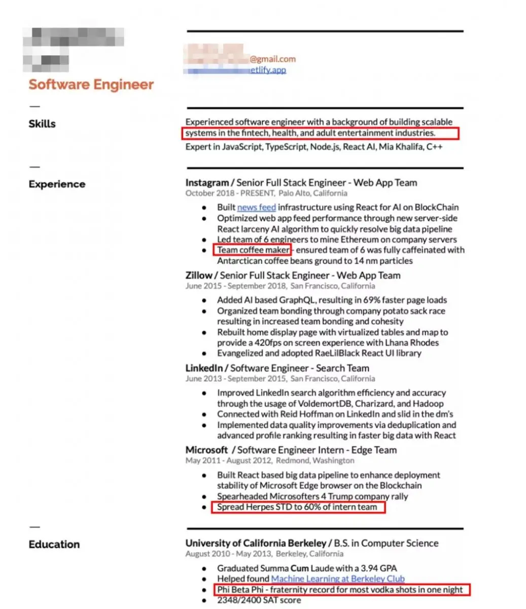 简历中提到的各种莫名其妙的经历,比如在Ins工作时为团队提供咖啡,在兄弟会创下一晚喝最多伏特加shot的纪录等,甚至提到自己具备丰富的成人娱乐行业工作经历,还把AV女主的名字写进精通skills?