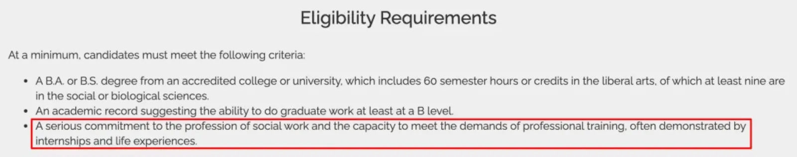 对于工作经历而言,相关性 > 含金量 > 数量;对于志愿者活动来说,含金量会比较重要。例如,哥大Social Work硕士的申请要求中,明确提到了要有社会工作相关的深度投入经历。在这样的情况下,像联合国的志愿者,就会比当地的社区志愿者更有含金量,更能得到招生官的认可。