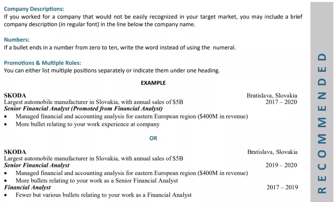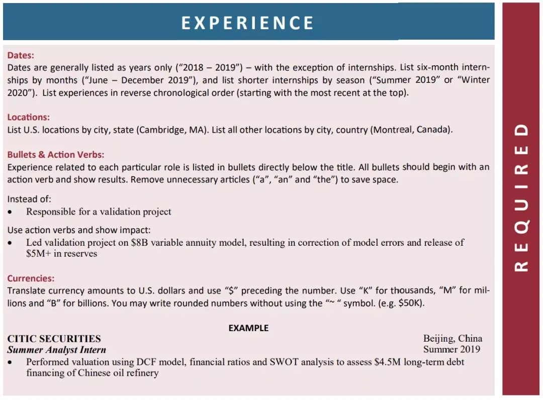 这里专门有提到时间、地点、货币的格式用法,以及bullets和行动词的重要性。比如"led validation project on $8B variable annuity model"就会比"responsible for a validation project"更能体现出你的专业能力。