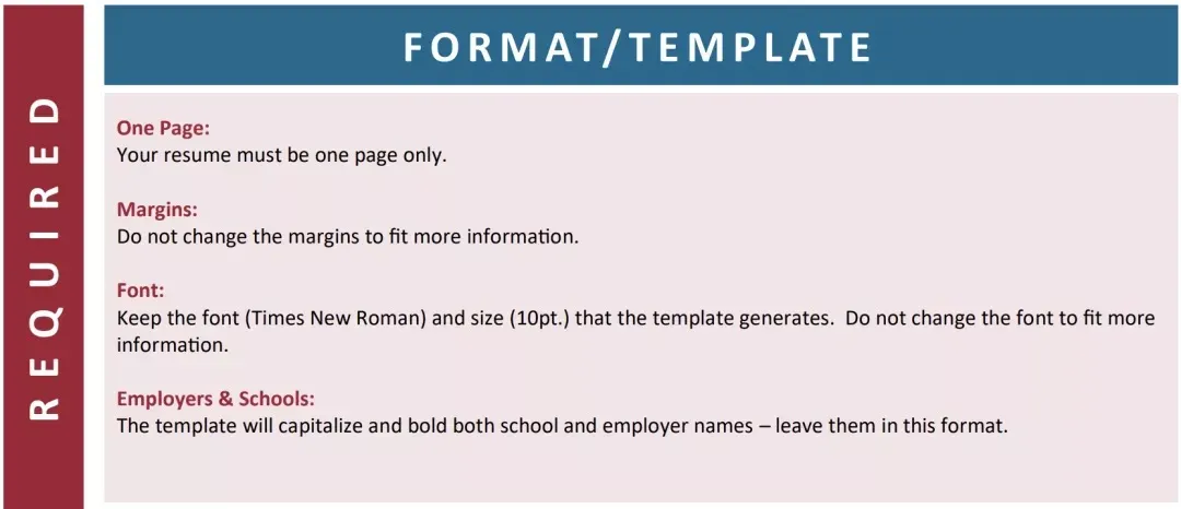 最后提到的格式问题,如简历需要保持一页,不要改变页边距,以及字体的格式和大小,专有名词的大写粗体问题,都需要大家留意。