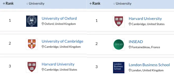 同榜单不同专业的排名也可能不一样。例如在QS排名里,历年的人文学科类和商科类专业的Top3排名就不尽相同。