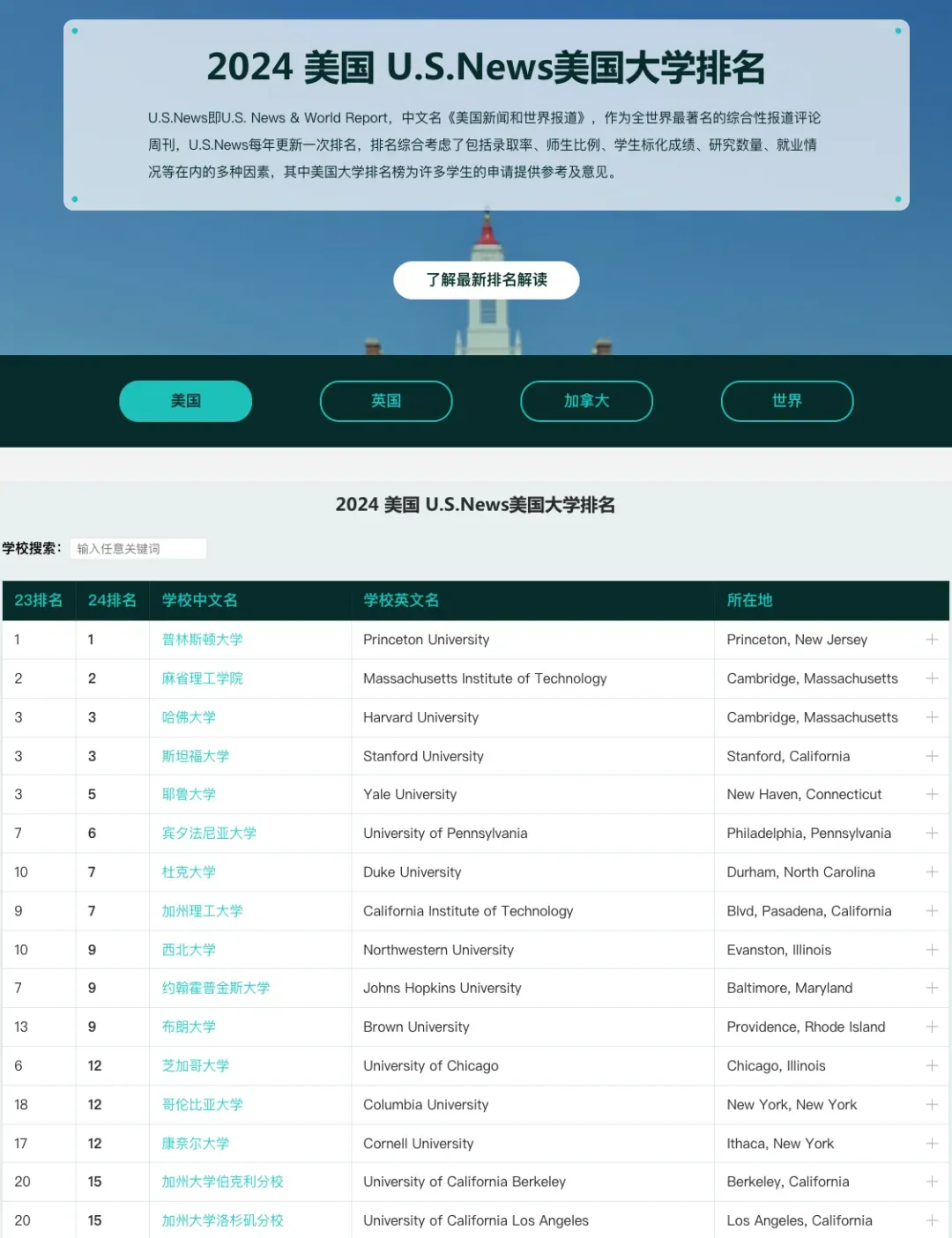 比如U.S. News全美大学排名是专门针对美国高等院校的排名,他们每年也会对不同专业的研究生院进行排名。商学院、法学院、医学院、工程学院、教育学院等,也都会有单独的研究生排名榜单。