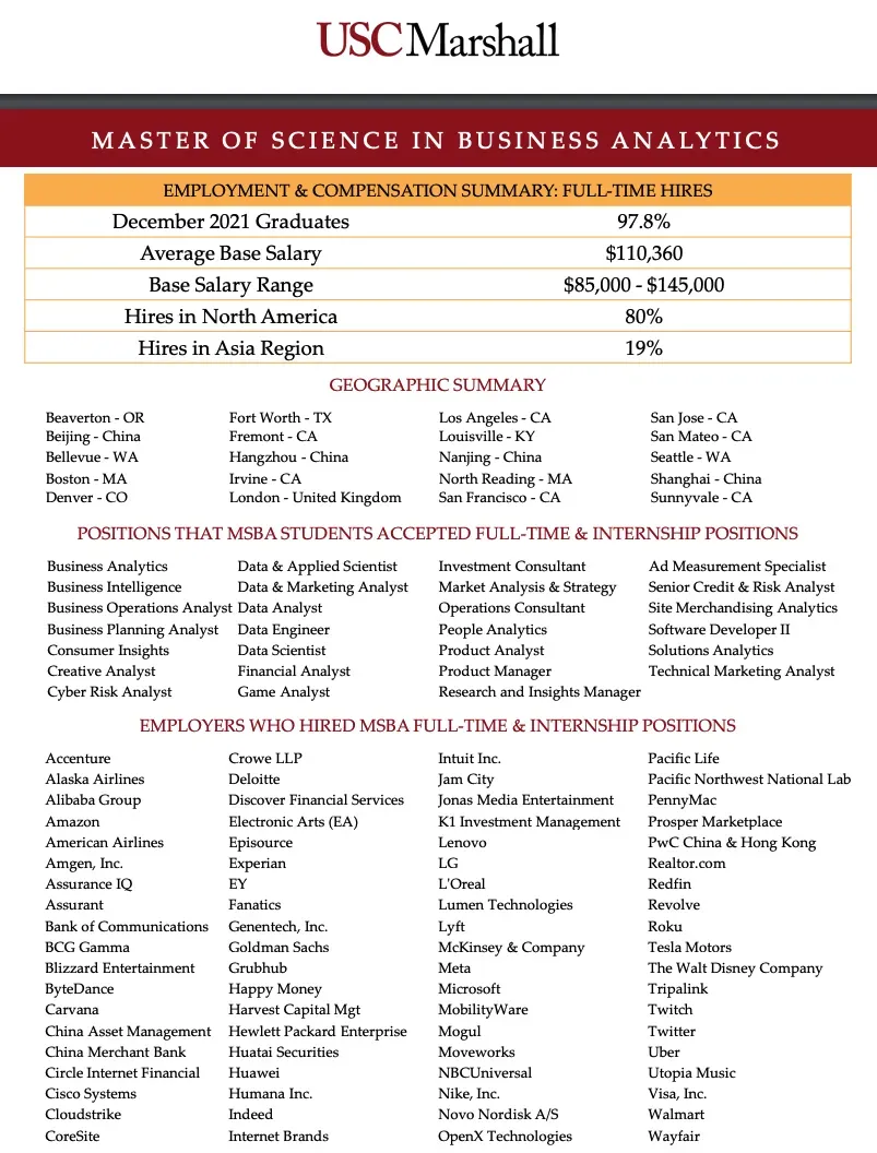 以南加大的Marshall商学院为例。在他们的官网上,就提供毕业生比较详细的就业信息报告,包括不同专业毕业生的起薪、就职地区城市,还有相应的工作职位等等。