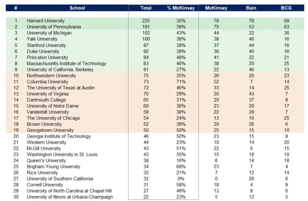 美国咨询行业Target School数据参考 来源:peakframeworks