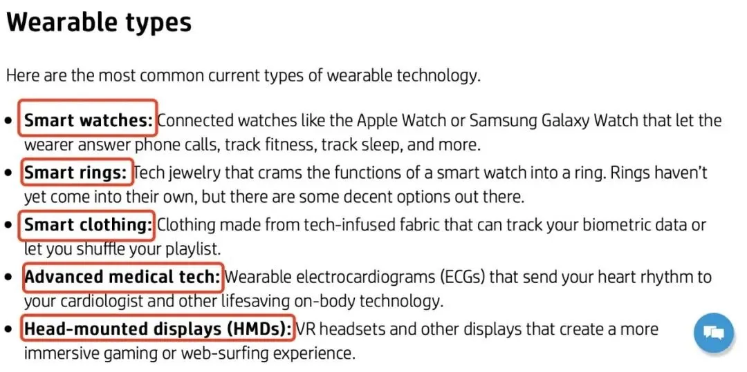 智能手表、智能戒指、智能衣物、心率检测仪、头戴式设备(VR、智能眼镜,等)。