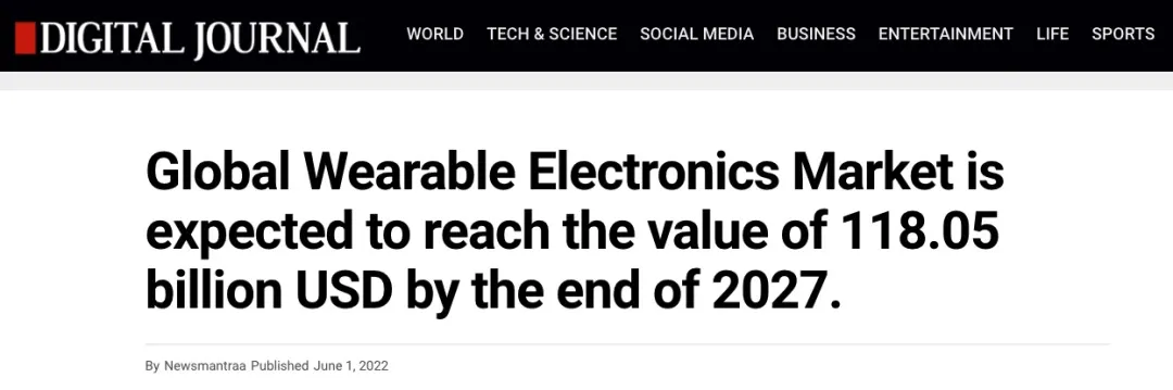 Digital Journal杂志说明,全球可穿戴式电子产品市场规模正高速扩大,预计在2027年底达到1180.5亿美元。
