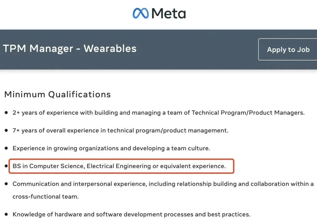以TPM Manager - Wearables为例,该岗位需要应聘者有CS或者EE的专业背景。