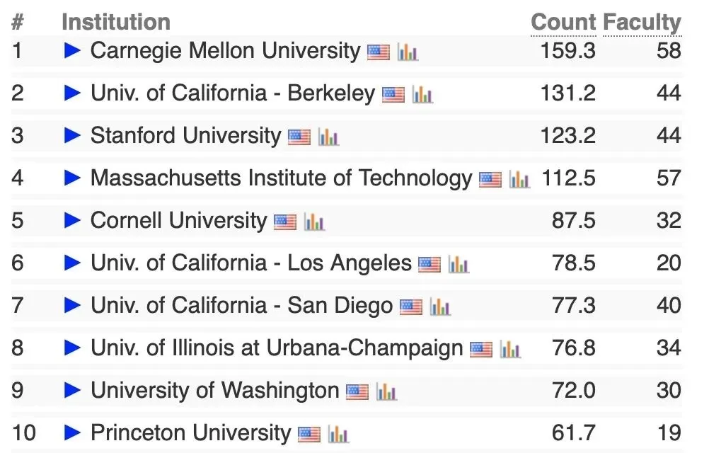 CS Ranking上关于Machine Learning的专业排名前10的学校有: