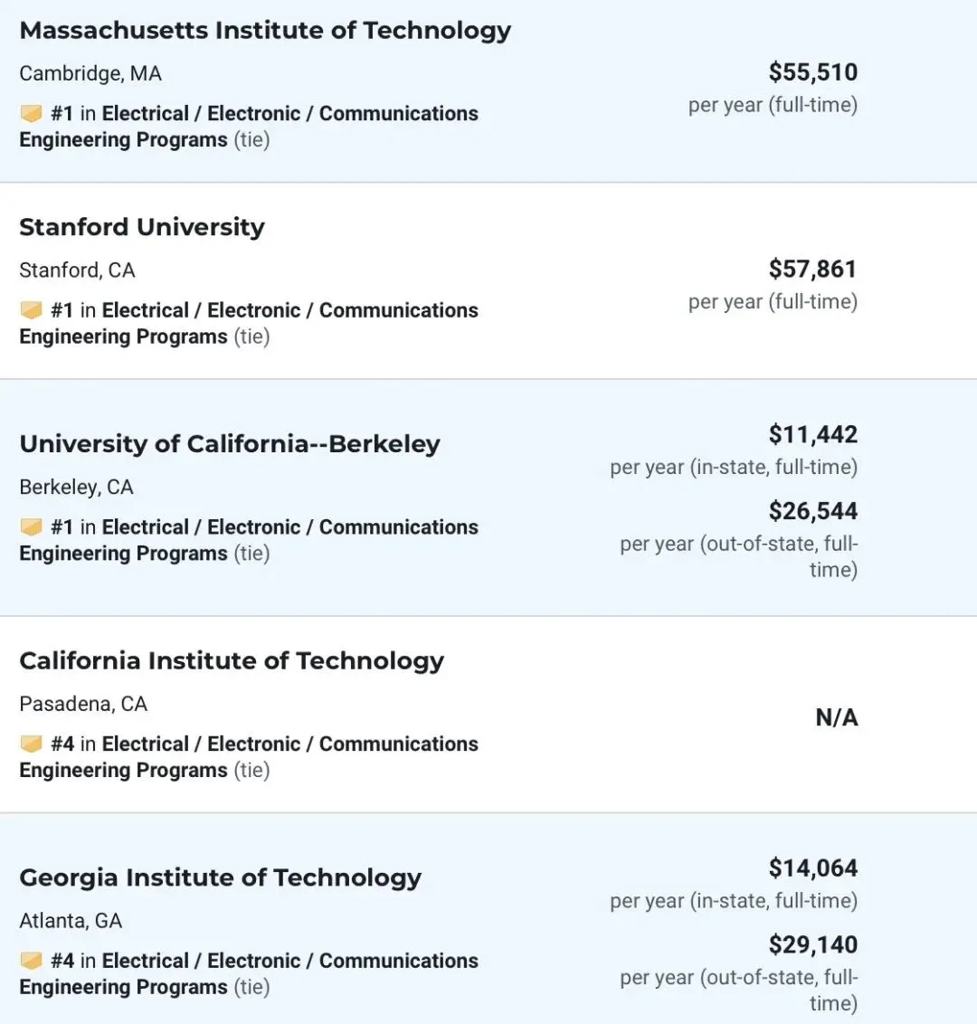 U.S. News上关于EE的专业排名,并列第一的是MIT,斯坦福和UC Berkeley。