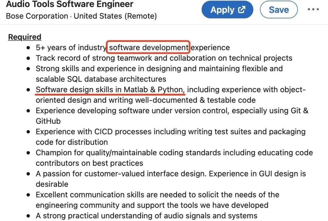 以Bose的要求为例,虽然没有明确要求申请者的学术背景,但是不难发现Software Engineering专业出身的人才,会更容易满足招录要求。