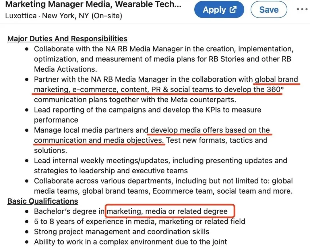 以全球领先的时尚、运动、奢侈品眼镜制造公司Luxottica为例,他们对于市场部的人才有以下要求: