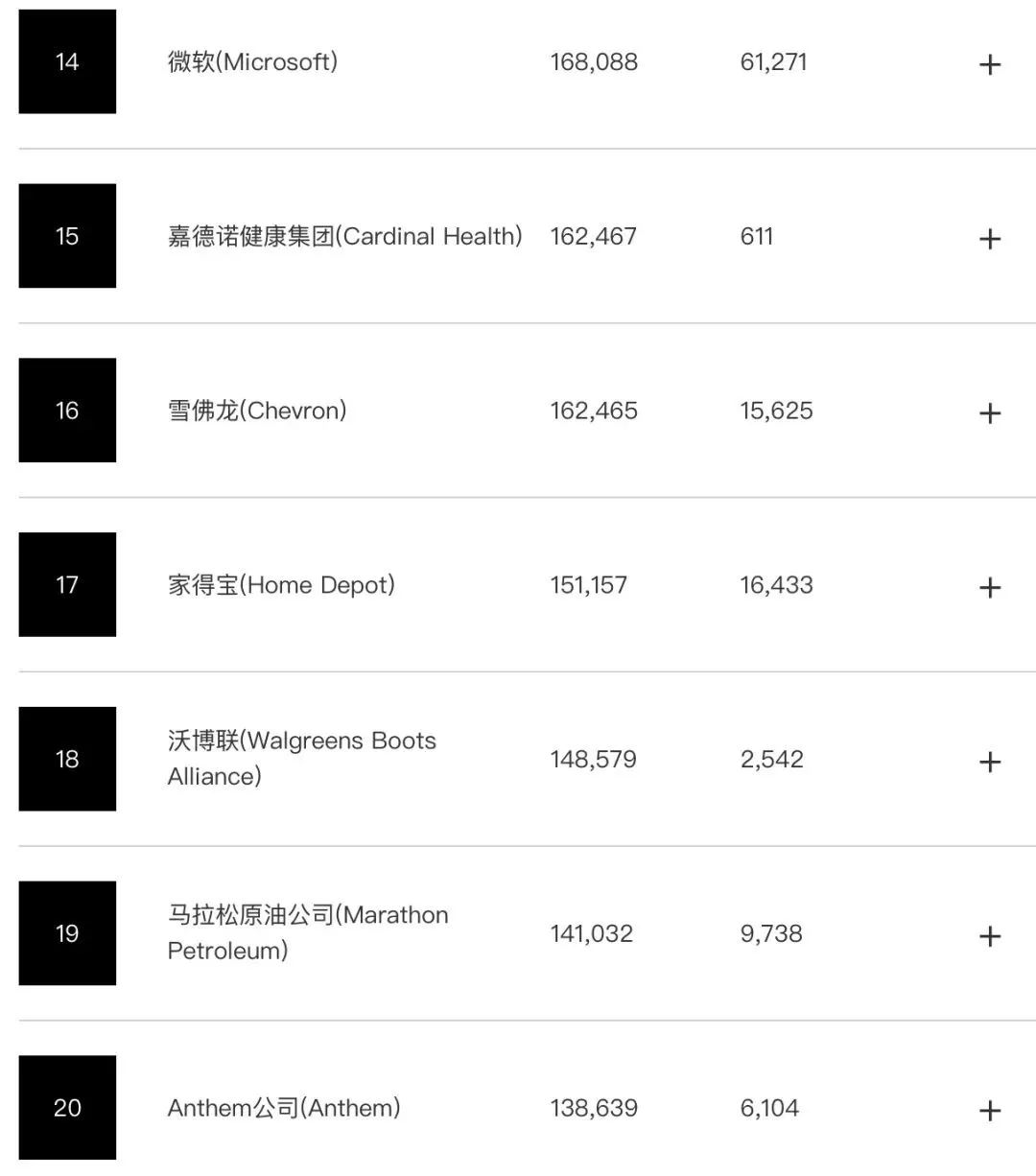 今年榜单的门槛较去年有了大幅提高,从53.7亿美元上升到了63.9亿美元,而上榜公司的总收入相当于美国当年GDP的70%。我们先来看一下美国500强的Top 20上榜公司:
