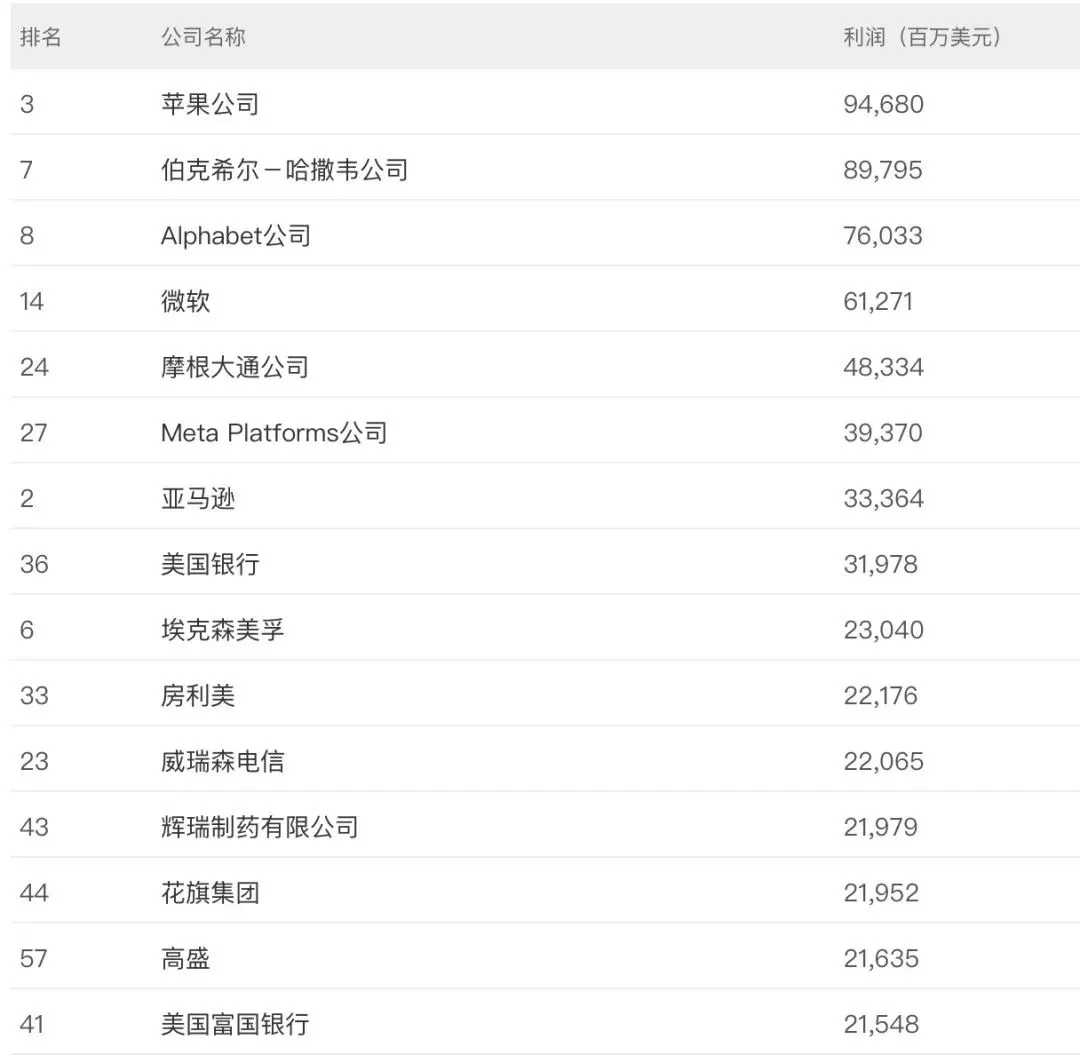 从盈利能力来看,苹果蝉联利润榜榜首,紧随其后的是股神巴菲特的伯克希尔-哈撒韦从,Alphabet,以及微软。