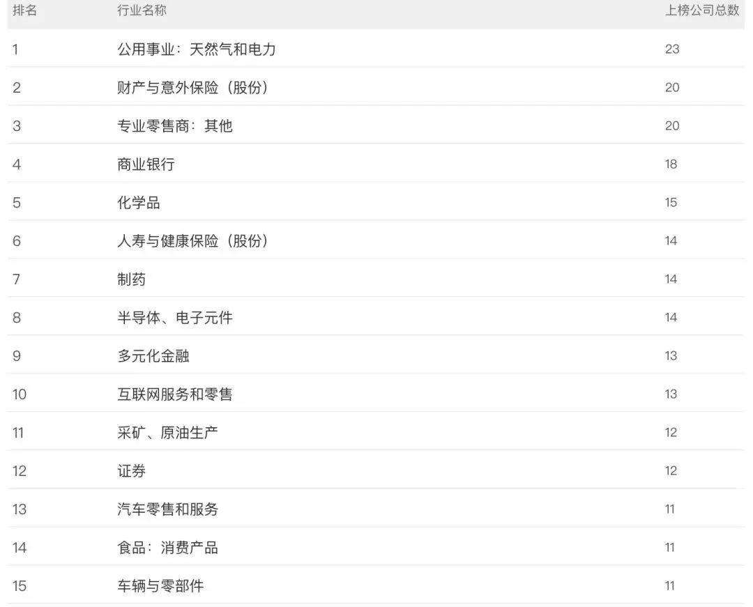 科技和金融行业仍是2022年最赚钱的两个行业,在最赚钱的前十家公司中,有8家来自这两个行业。从上榜数量来看,2022年天然气和电气行业稳居第一,在500强中有23家公司来自这个行业。