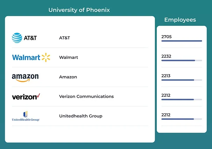 凤凰城大学有15,924名校友就职于财富500强公司Top20公司,位列榜单第一。