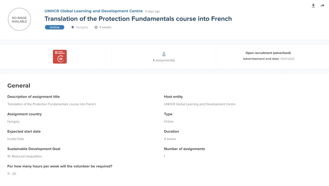 - General: 需要的志愿者数量、工作周期以及每周工作时长