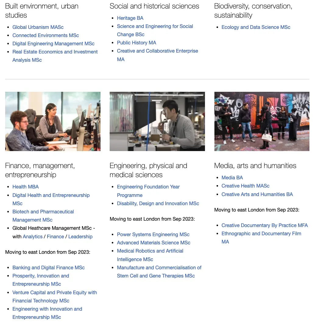 除了优美的环境外,最受学生们关注的还是新校区的专业项目选择了。目前,UCL East集结9个UCL学院,将提供近60个学位课程