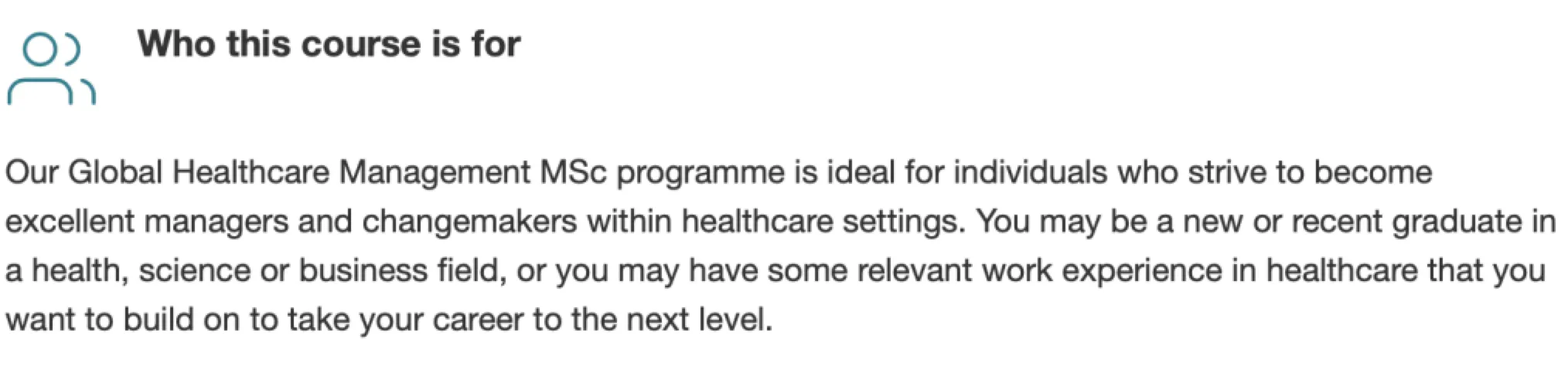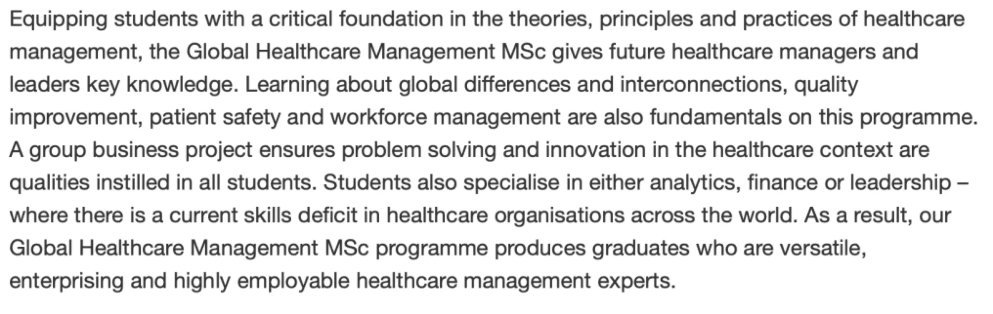 以MSc Global Healthcare Management(全球医疗管理)新项目为例虽说是偏商科管理的项目,但官网也明确说明: