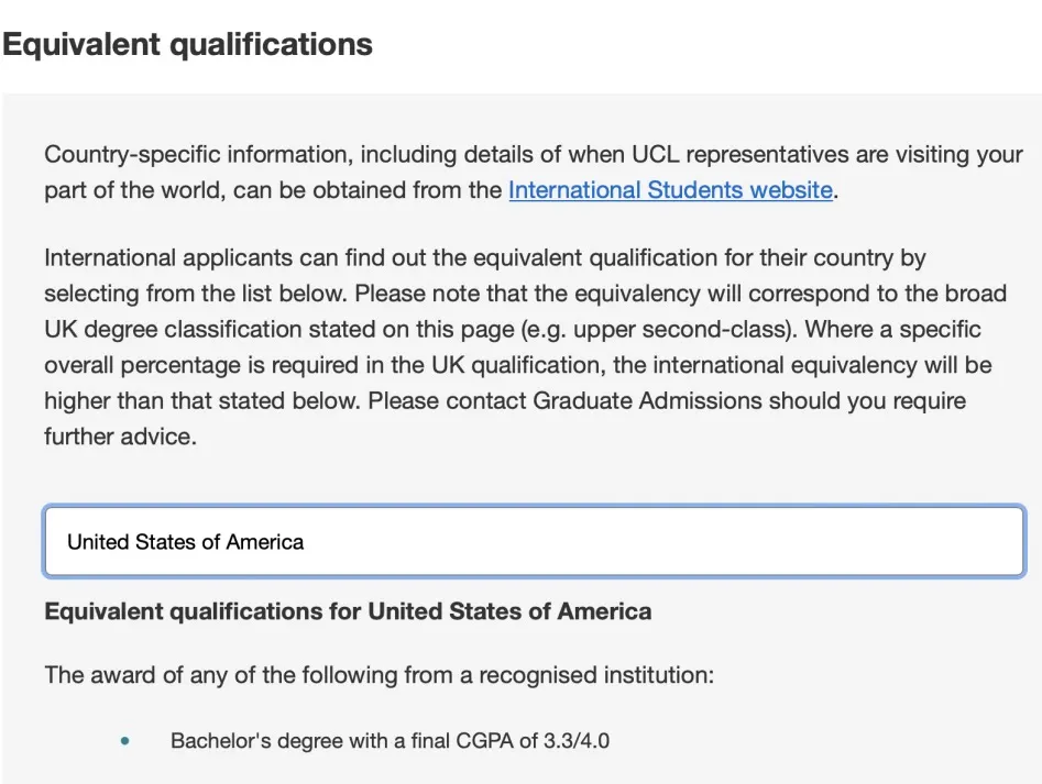 对于本科不在英国就读的同学,可以查看该专业官网针对不同国家的成绩换算。像美本学生申请的话,官网一个项目给出的建议成绩是CGPA3.3/4.0。