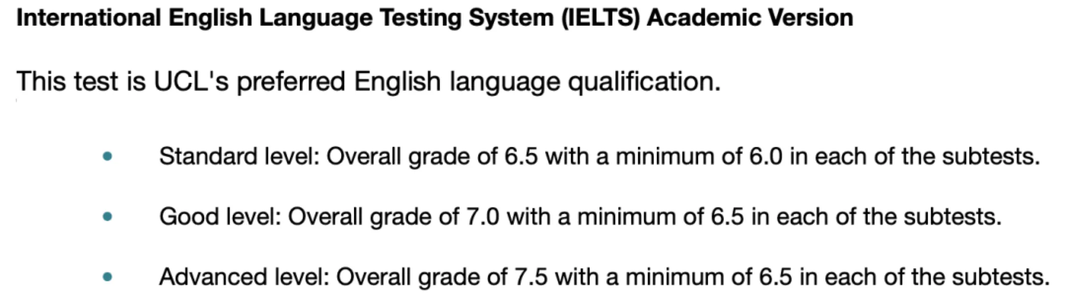 以雅思考试为例,UCL官网把雅思成绩分为了Standard, Good和Advanced三个级别,而不同专业对语言级别也有自己的要求。
