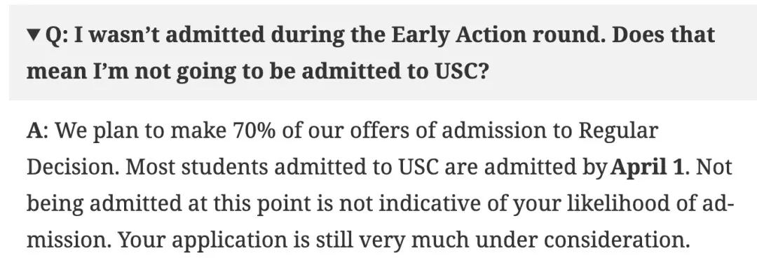 学校表示,70%的offer名额将给到RD常规批次,于4月1日前通知。如果EA轮没有被录取,依然有可能被放进RD池进行考量。