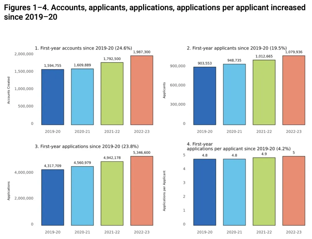 根据Common App发布的《2022-23学年美本申请趋势》,今年的美本申请人数和申请量均大幅上涨。