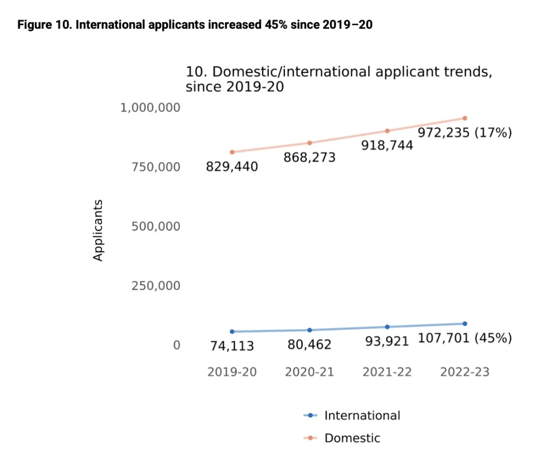 其中,国际生申请申请人数连续4年上升。今年国际生申请人首次突破10万人,较疫情前暴涨45%。Top5国际生生源地依次为:中国、印度、尼日利亚、加纳、加拿大。