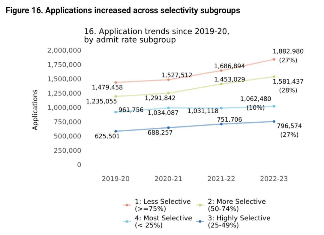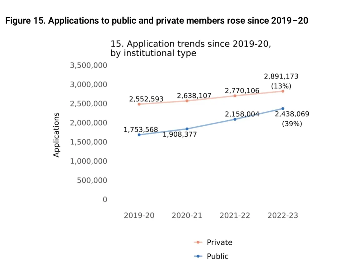 此外,私立大学申请量超过289万,超过公立院校,这可能与私立大学提供更多早申选择有关。