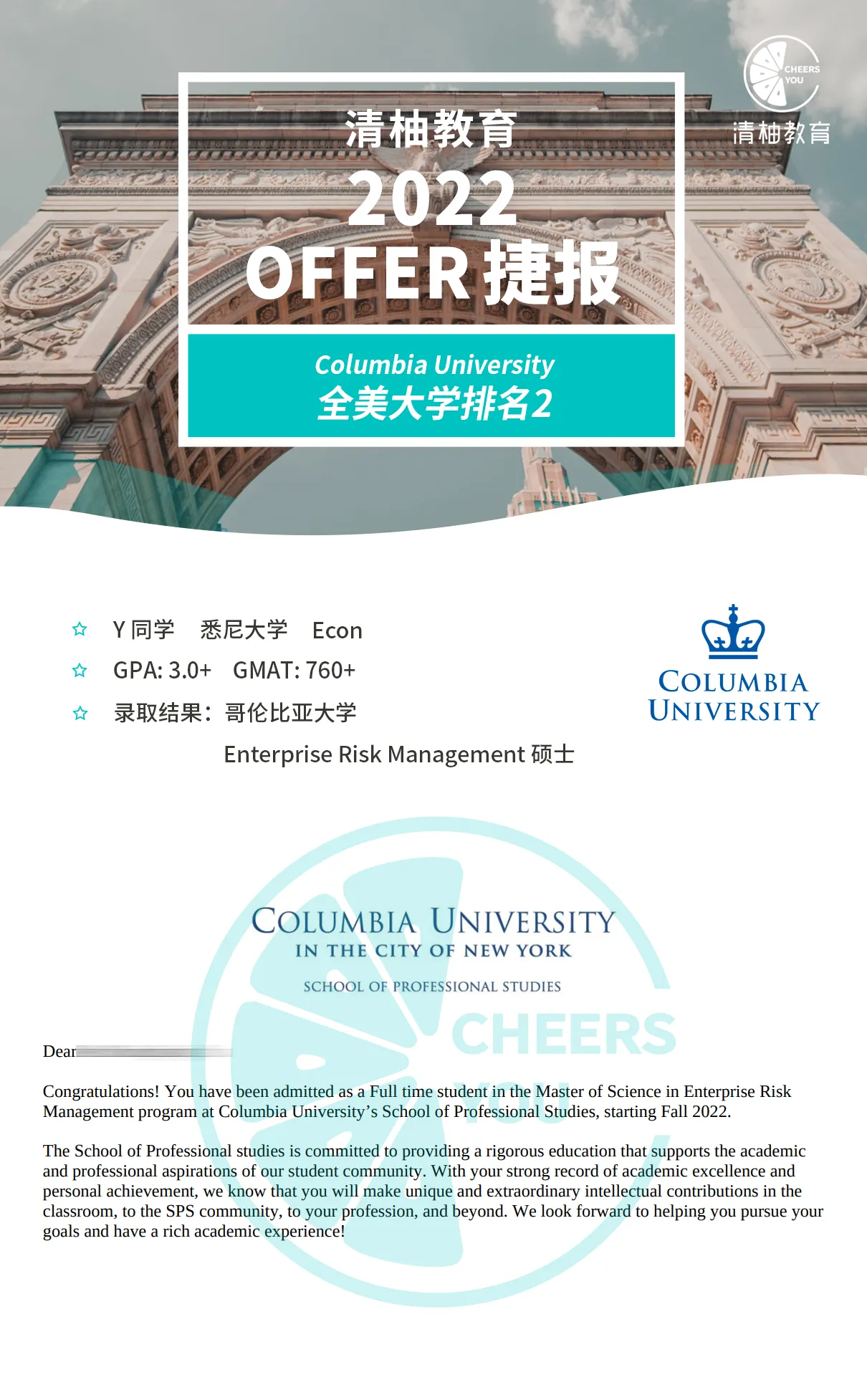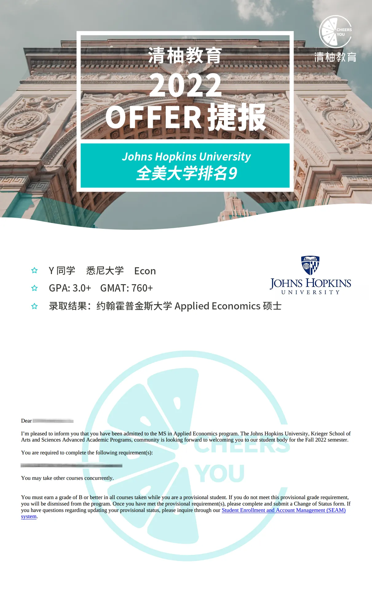 恭喜来自悉尼大学的Y同学,斩获哥大和JHU的offer两枚!!