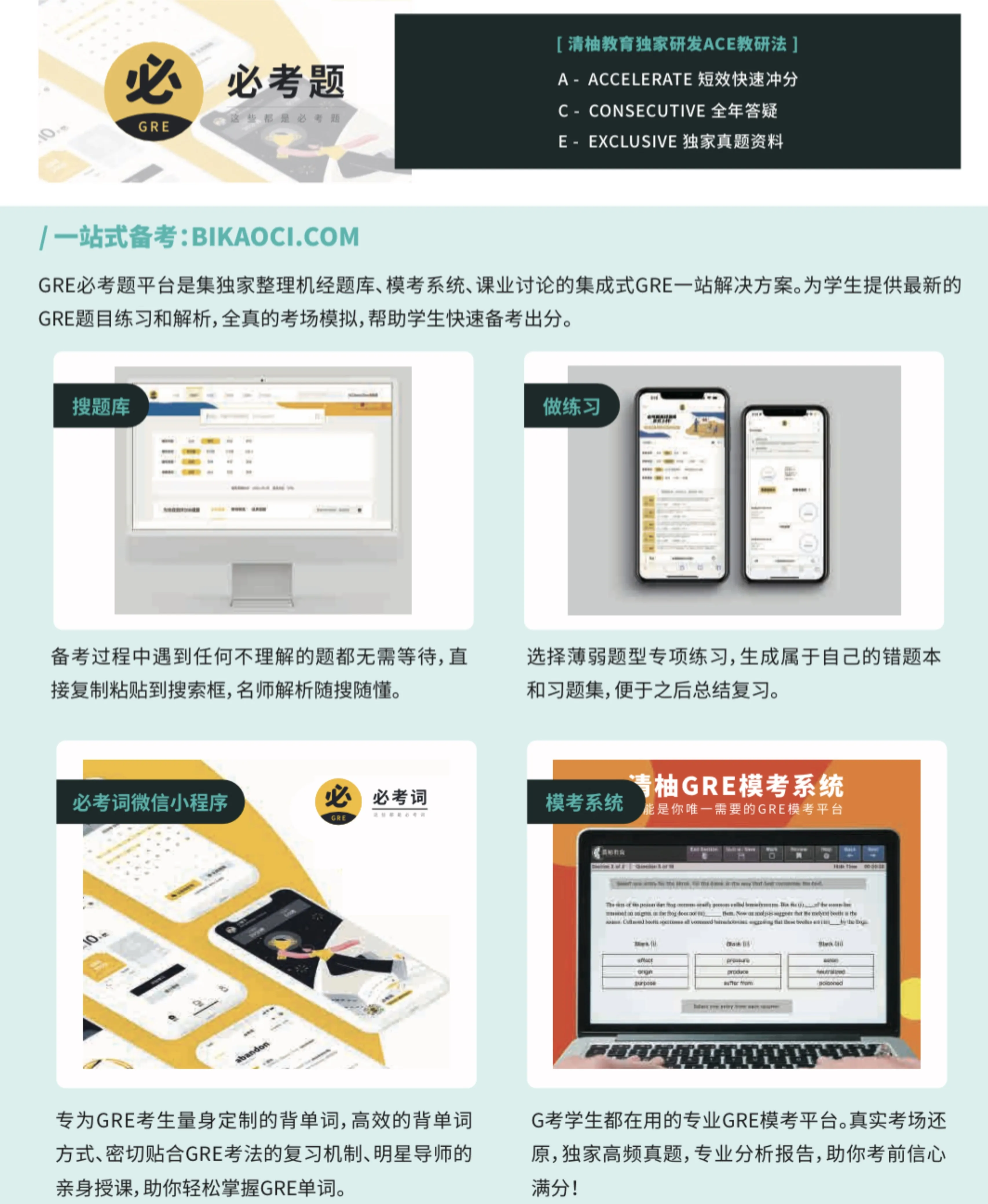 清柚申研服务包含GRE课程学习。从基础考试介绍,到做题技巧方法,到巩固强化提高,备考一步到位。