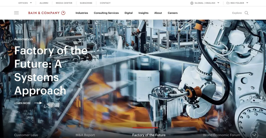 大型国际管理咨询公司贝恩公司(Bain & Company) 为各个行业的高管提供从营销和战略到IT和并购的建议。该公司的全球总部设在马萨诸塞州的波士顿,拥有约1.5万名员工。