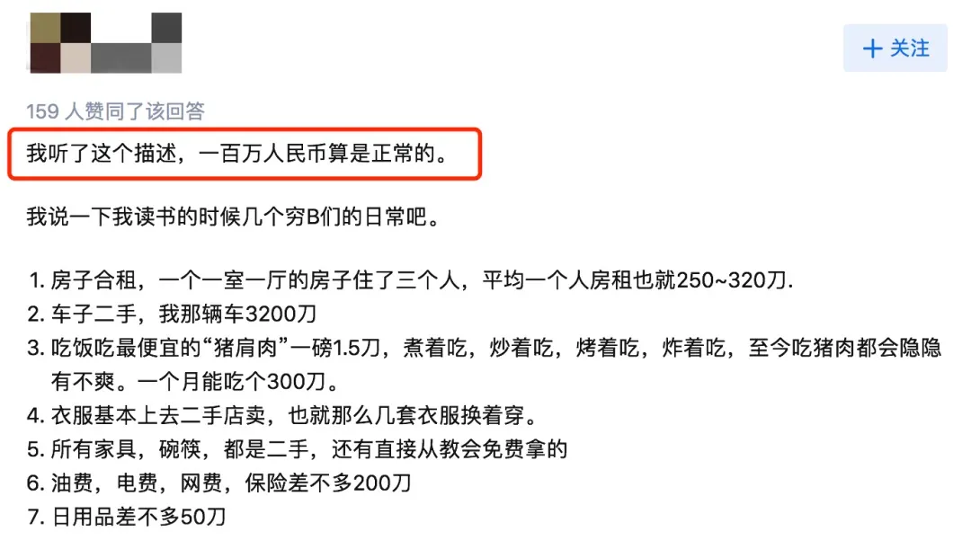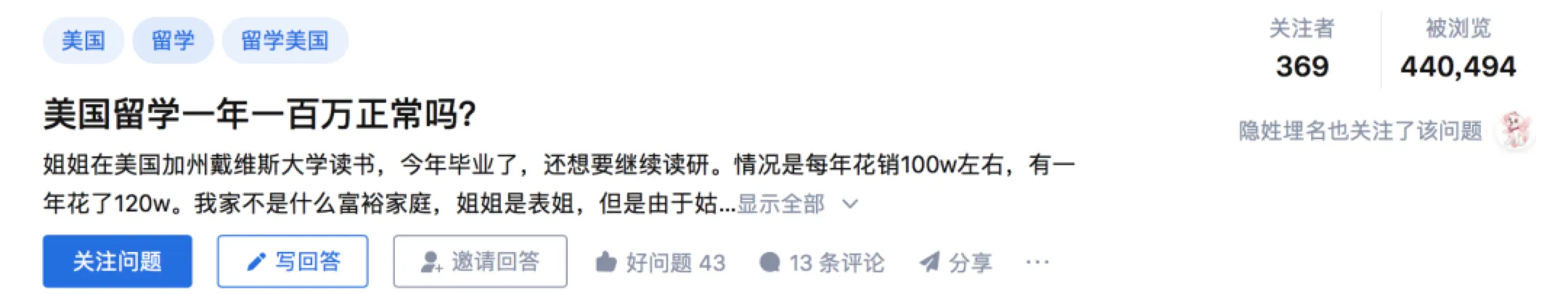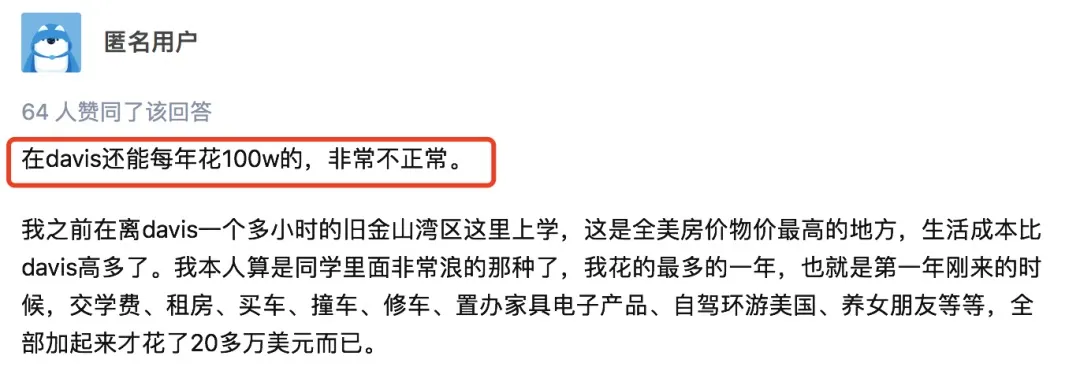 评论里的回答也五花八门,有人觉得「北美留学就是贵一百万人民币是很正常的事情」,也有人觉得「这完全不是在Davis的留学生的消费水平」。