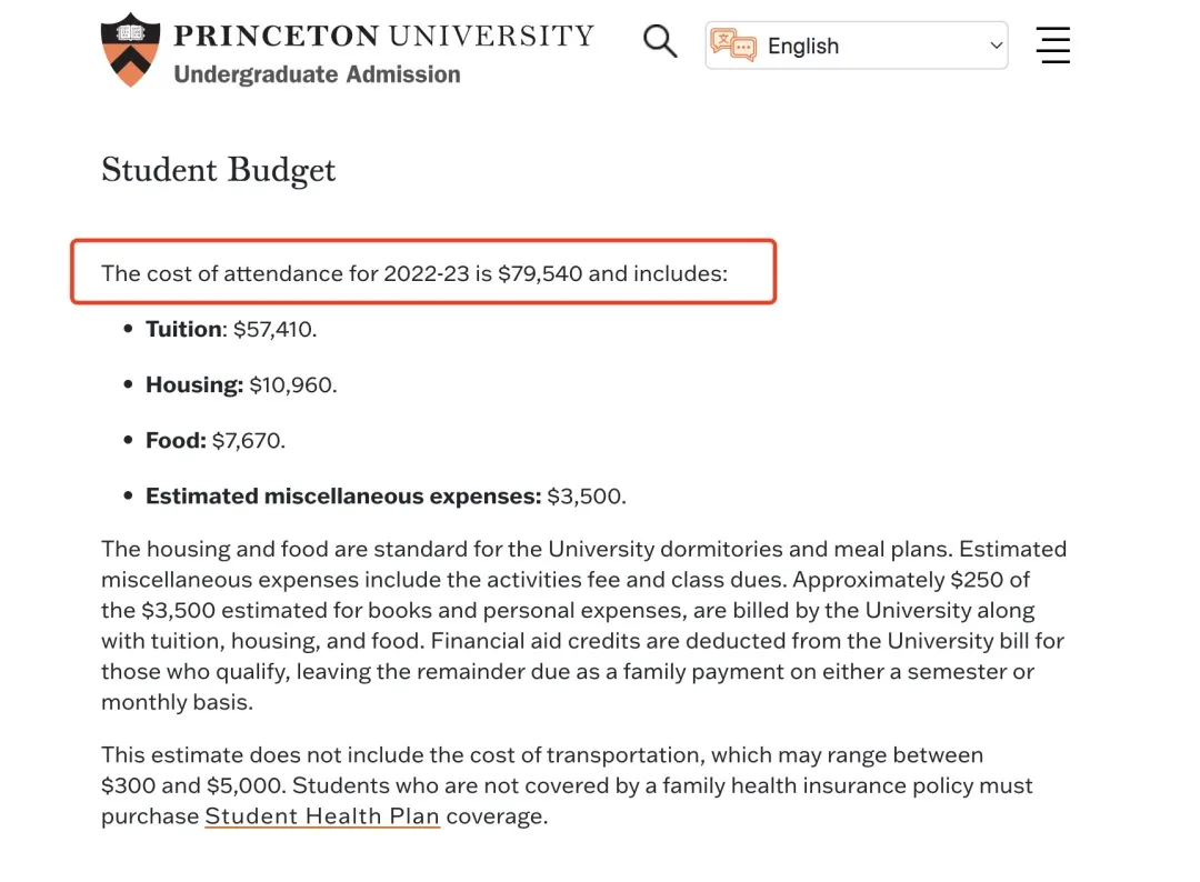 以坐落于美东地区的普林斯顿大学为例,普林斯顿大学公布了其2022-23学年本科生的费用预算,共计79,540美元,其中包括学费57,410美元。