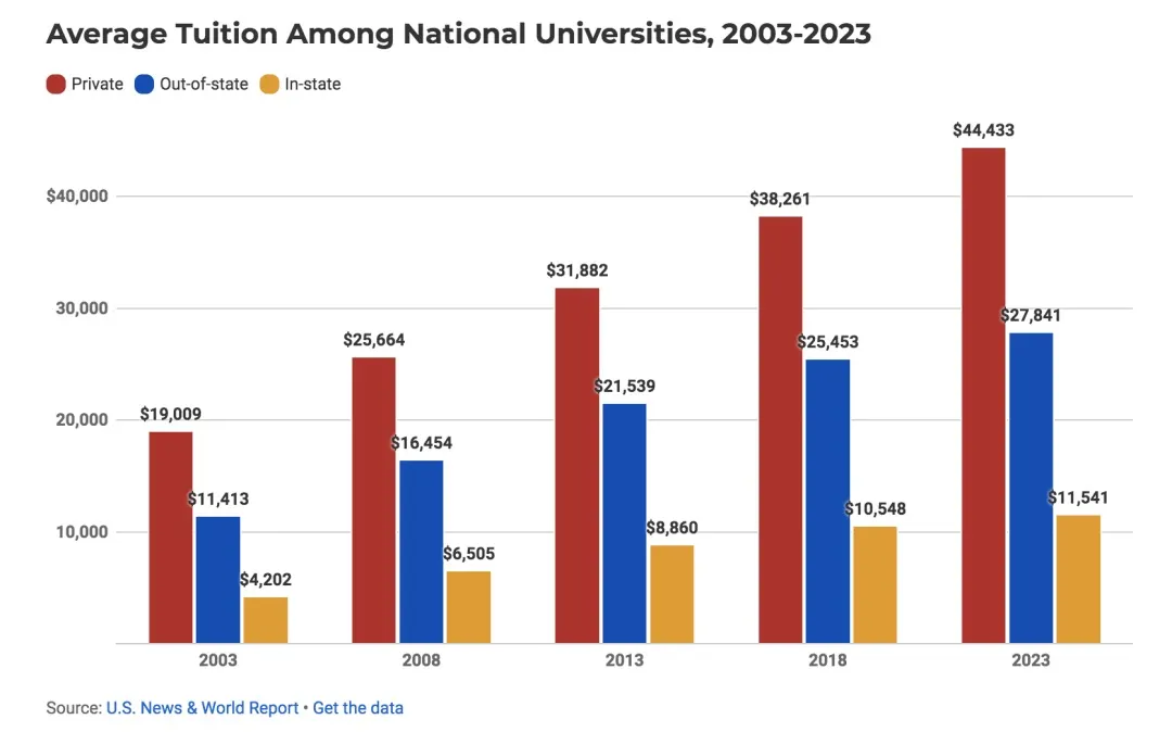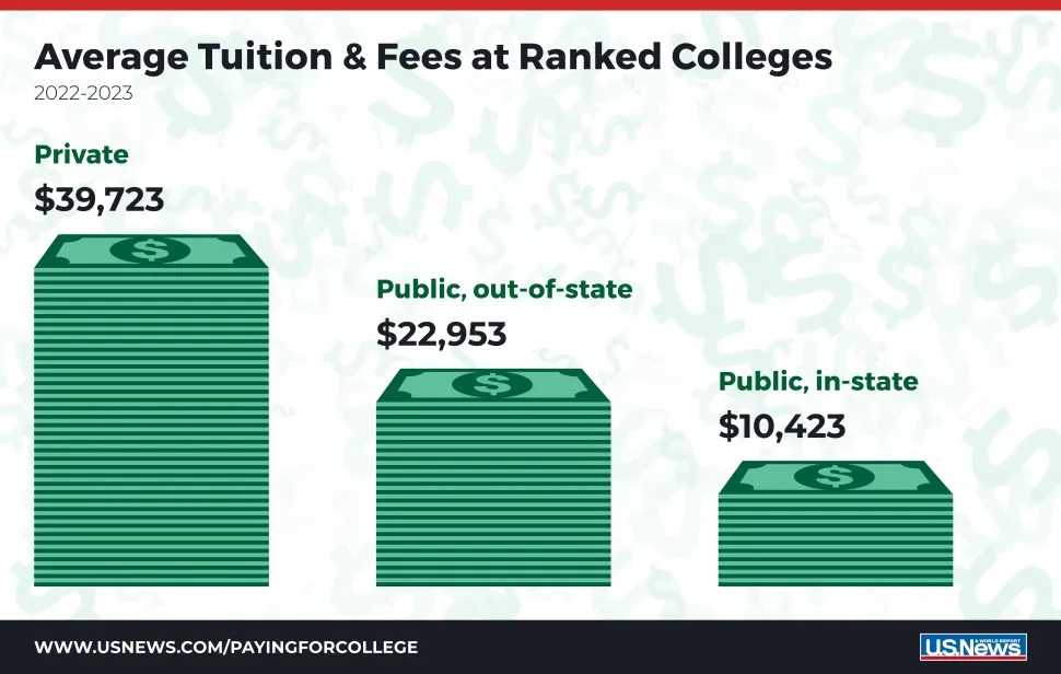 U.S. News 数据显示,就读公立大学州内的平均学费成本比私立大学的平均标价低约74%,2022-2023年分别为10,423美元和39,723美元。同年,公立大学州外学生的平均费用为22,953美元。