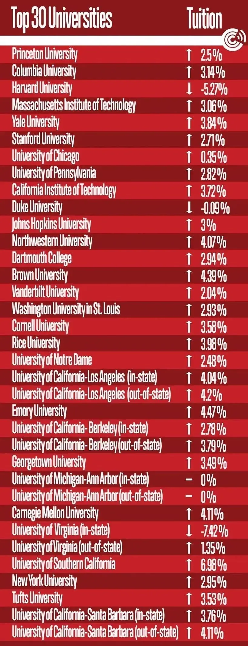 此外,部分大学学费年年涨,也是另留学生苦不堪言。Campus Reform的报告显示,以过往4个学年为基准发现,美国排名Top 30的大学中,有27所学校在下一学年的收费都有所上涨。