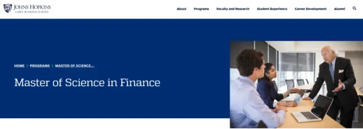 该项目下设于约翰霍普金斯大学Carey商学院,为STEM学科。主要培养的是学生的领导能力和数据分析能力,并从数据中学习,从而影响全球企业的长期可持续性。课程帮助学生建立创业能力,以了解全球金融市场及其对当地投资环境的影响。金融项目为学生准备参加CFA考试做准备,培养学生有关公司财务和估值、公司治理以及证券分析和投资的理论知识。