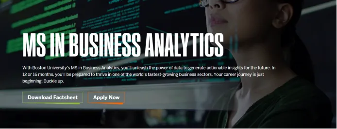 波士顿大学的BA项目下设于Questrom 商学院,属于STEM项目。BA项目需要在12~16个月的课程时间内修满37个学分。该项目将培养学生批判性思考现实商业环境中数据问题的能力。项目侧重高级统计、机器学习(含编程)的技能学习与应用,同时,也会培养学生的沟通、协作和领导能力等软性技能。