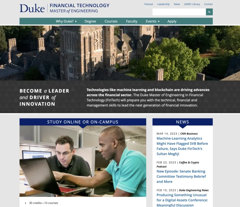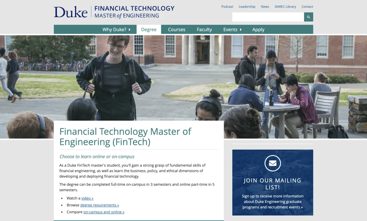 金融科技硕士项目是普拉特工程学院和杜克金融经济中心(DFE)于19年联合推出的新项目,项目时长为3—4学期。